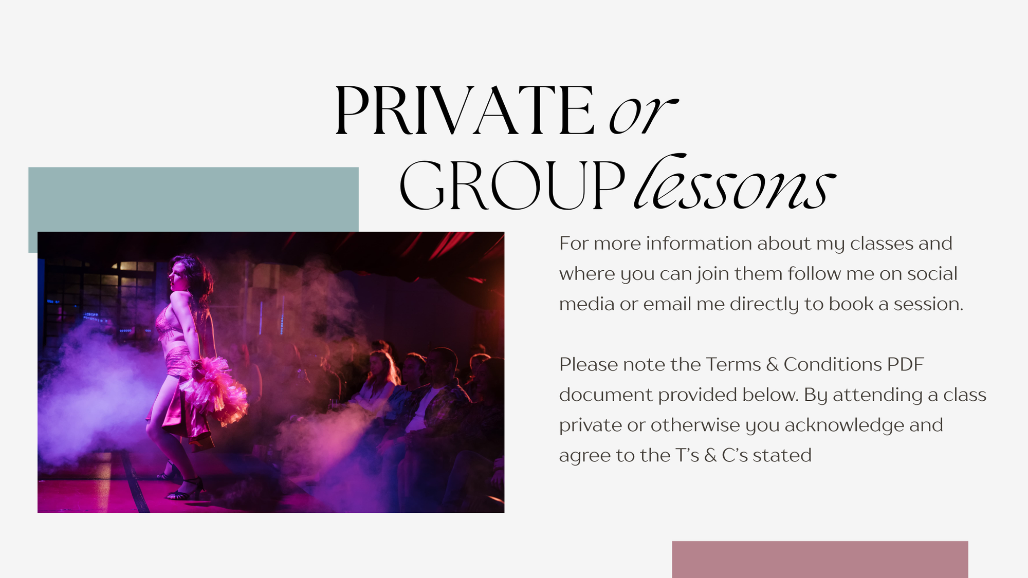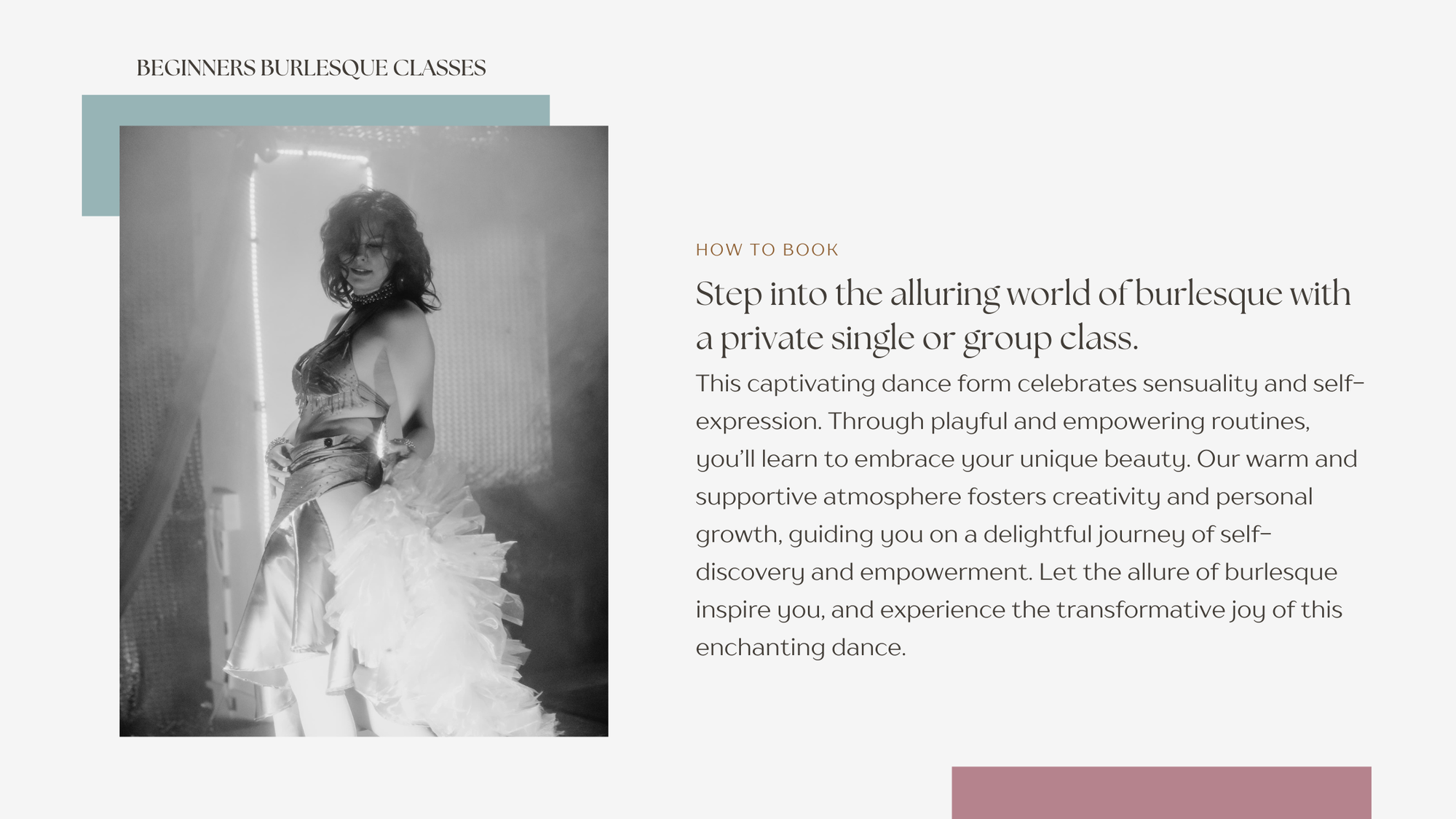 Step into the seductive world of burlesque with private personal classes or group lessons – where confidence meets playful allure. Feel the thrill of taking control of your body, owning every movement with poise and sass.